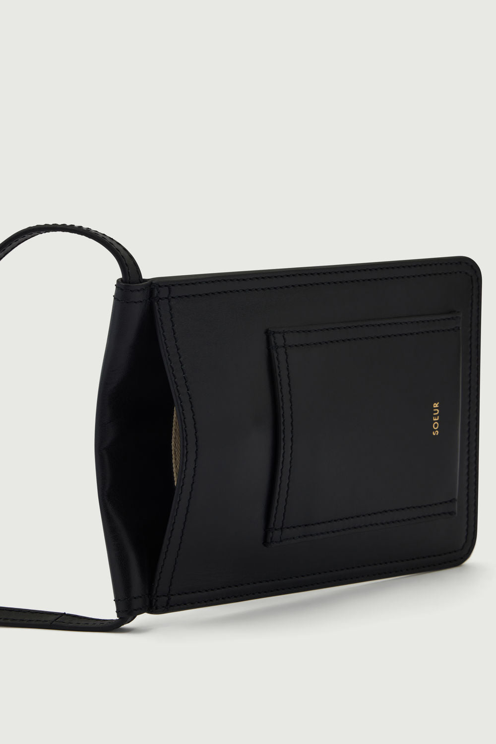 Smooth leather flat pouch with shoulder strap black